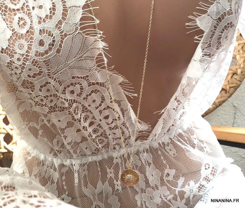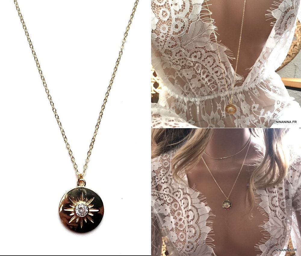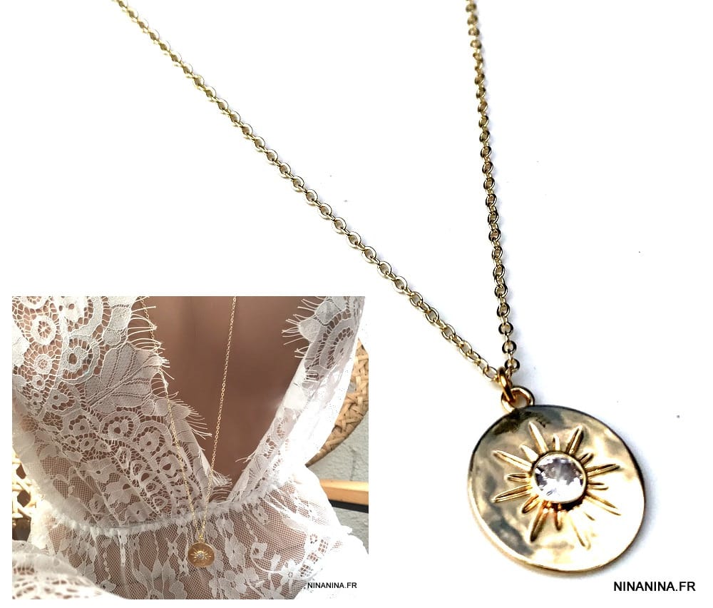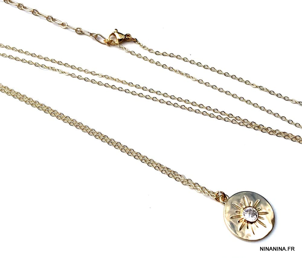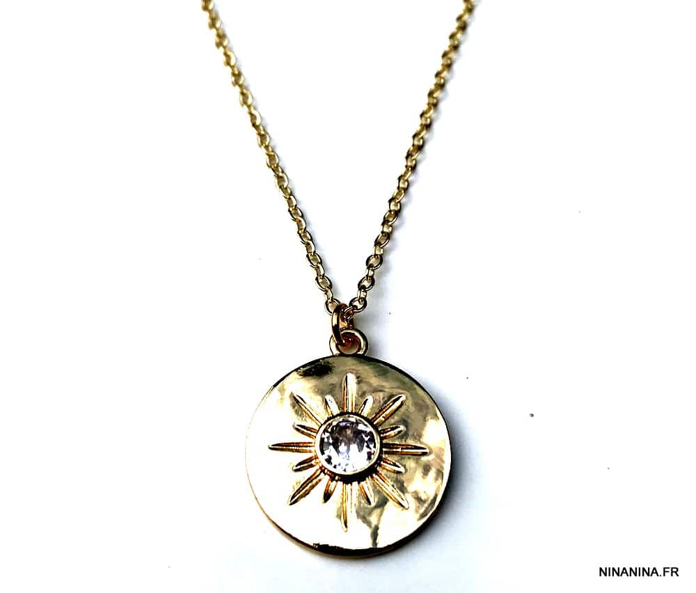 Sautoir medaille or soleil – Collier long laiton zirconium
